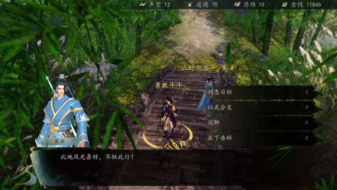 买完空竹去村口触发传闻<青莲门徒>,自己酿一瓶竹叶青酒,找到桥上的三绝剑客崔澜,先以武会友打一架然后送酒,再切磋一番之后崔澜会教你《青莲宝典》