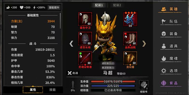 这个版本,只有马超是YYDS!3技能是输出最高的技能,没有之一。套装的每点力量额外3点基础伤害,让输出彻底爆炸,配上魔魂雷电主教,攻防一体,所向披靡。可以说,这个游戏只要马超培养好了,大部分关卡都是无脑破的。