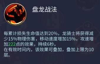 盘龙战法:每累计损失生命值达到20%,龙骑士将获得减少15%物理伤害,移动速度增加15%,攻速增加222点的效果,持续6秒。在有效时间内,该效果可叠加,叠加上限为10层。