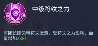 中级符文之力:军团长期佩戴符文徽章,受符文之力影响,血量增加2381