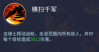 横扫千军:龙骑士挥动战枪,击退范围内所有敌人,并对每个目标造成3012伤害。