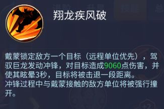 翔龙疾风破:戴蒙(龙骑士)锁定敌方一个目标(远程单位优先),驾驭巨龙发动冲锋,对目标造成9060点伤害,并使其眩晕3秒,目标将被击退一段距离。冲锋过程中与戴蒙接触的敌方单位将被强行撞开。