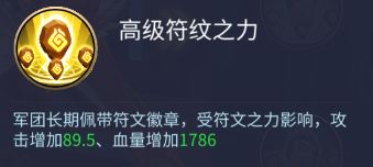 高级符文之力:军团长期佩戴符文徽章,受符文之力影响,攻击增加89.5,血量增加1786