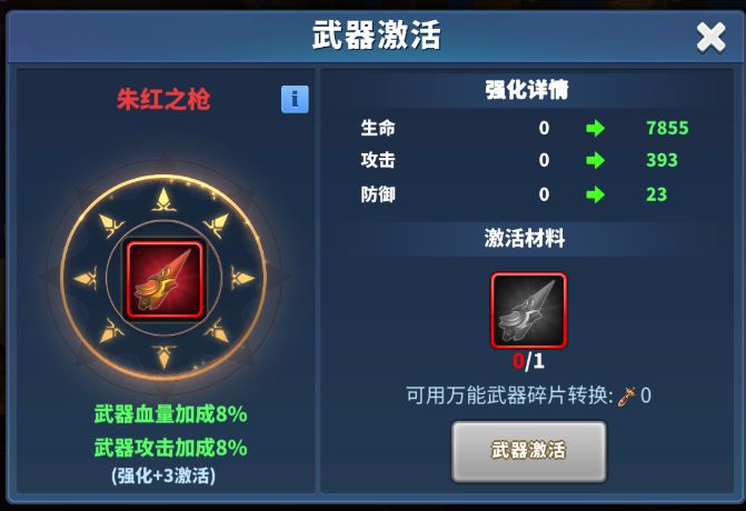 朱红之枪需要强化达到3级后才能激活,激活后的buff加成有:血量和攻击加成。
