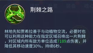 荆棘之路:林地先知贾希拉善于与动植物交流,必要时也可以利用这种能力在指定区域召唤出一片荆棘,对区域内所有敌方单位造成7189点伤害,并降低其移动速度30%,持续6秒。