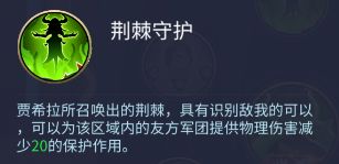 荆棘守护:贾希拉所召唤出的荆棘,具有识别敌我的功能,可以为该区域内的友方军团提供物理伤害减少20的保护作用。