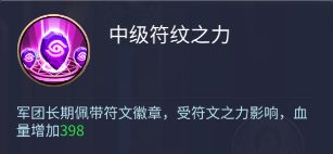 中级符文之力:军团长期佩戴符文徽章,受符文之力影响,血量增加398