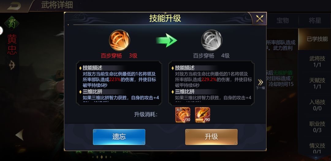 技能激活需要十片同技能碎片,激活后需要升级技能,技能等级最高20级,等级越高其战力提升的越高。升级技能需要技能碎片+绝世残卷两种材料资源。
