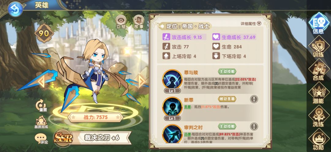 这个羁绊就相当于提升了每个人的英雄强度,建议全sr,有耐心的可以全+3。这些用于前期过渡应该是不会有太大问题了。但是玩到最后会发现圣语肌无力,问题不大,忍忍就好了,忍忍就习惯了。