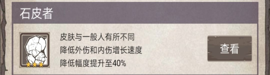 石皮者 上榜理由 这游戏不吃不喝不会死 只要有内伤 一切皆可能 三星石皮者外加人物内伤基础25以上能在零下五十度的情况下睡一天不死 并且在基础外伤20以上能减少绷带的使用量!!