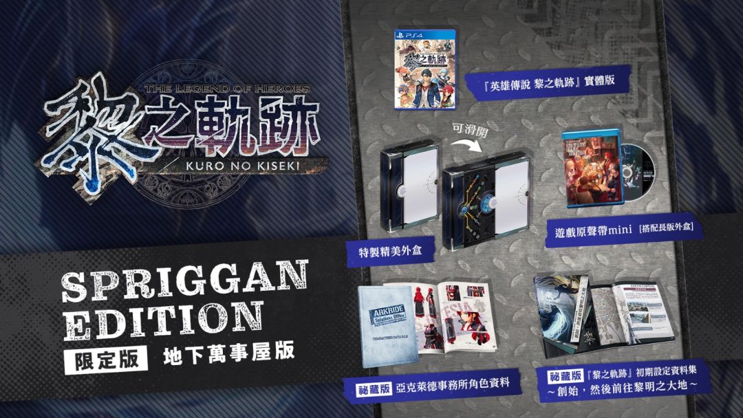 『英雄传说 黎之轨迹 SPRIGGAN Edition(地下万事屋版)』总计收录《英雄传说:黎之轨迹》PS4实体光盘、特制精美外盒、搭配专属长版外盒的游戏原声带mini,以及只有地下万事屋版才有收录的密藏版『亚克莱德事务所角色资料』与『黎之轨迹初期设定资料集~创始,然后前往黎明之大地~』。