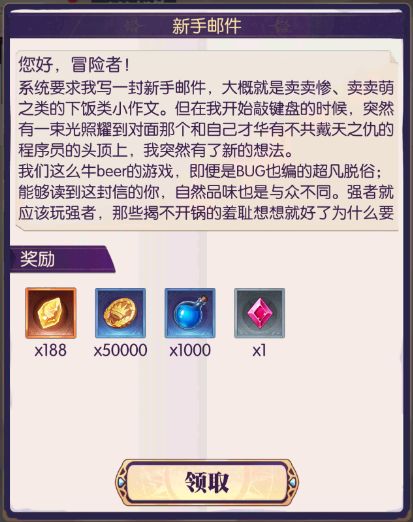 以游戏内邮件形式发送,进入游戏即可领取一份新手邮件。内含丰富游戏道具,恒晶188,一发入魂,大锅小锅任你选!