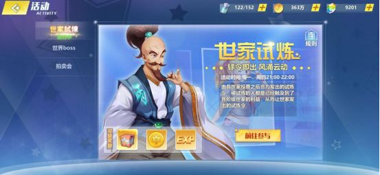 击败BOSS可获得【试炼之证】,收集到的试炼之证达到相应的数量要求,即可兑换界面下方的奖励哦!奖励包含:活跃宝箱、金币、世家贡献。