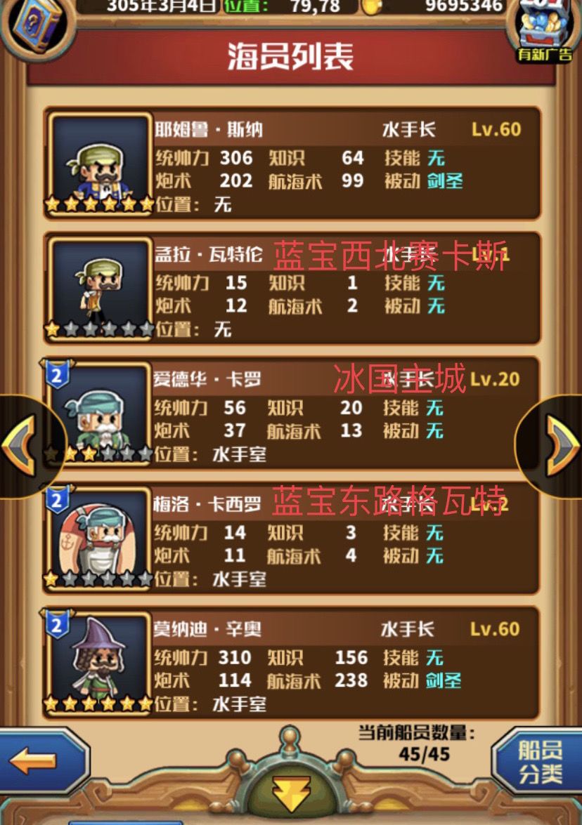 由于后期缺水手长,打牌地毯式搜索,终于找到了5大无技能水手长位置,加上带技能的水手长共15人!所有带技能海员加这5个无技能水手正好45满员,完美