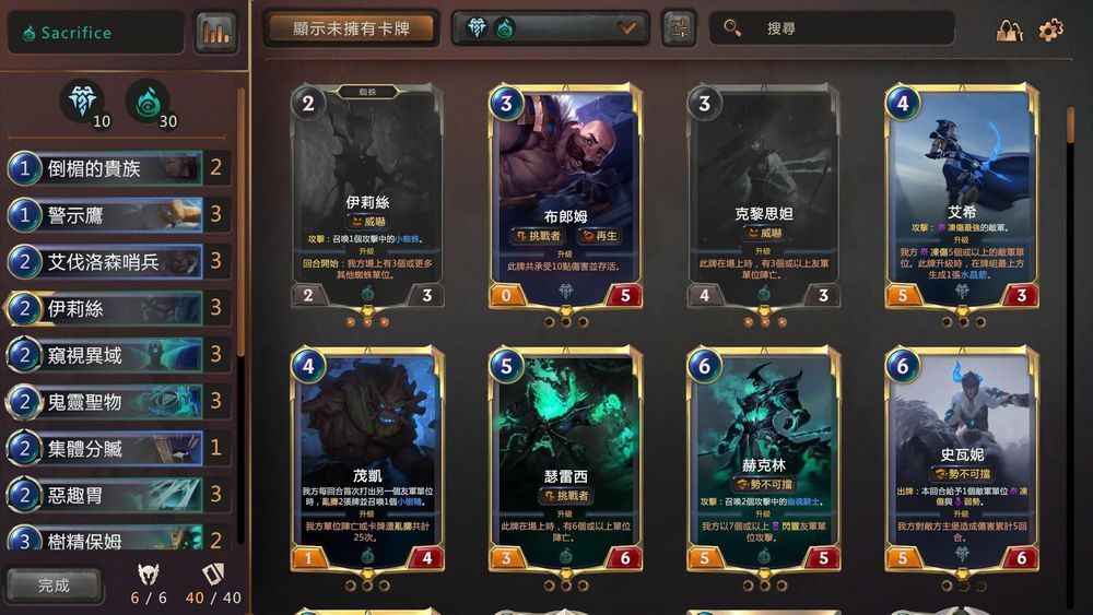 基本上多数时候对面都是被烧死的,而这副牌比纯韧兽优的地方就在于韧兽无法收割时,还有足以斩杀的备案,韧兽通常只有对面有维持住场优才需要出,所以起手留牌尽量不要留韧兽,警示鹰、贵族、伊莉丝、哨兵是起手比较好的单位,鬼灵圣物能留2,窥视异域能留1,其余要根据对方牌组选择。
