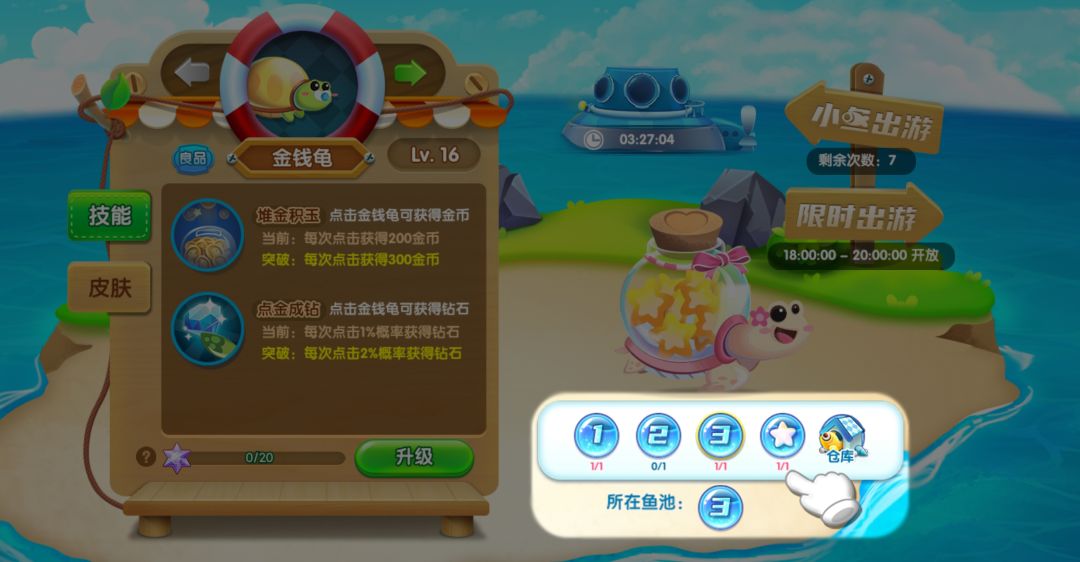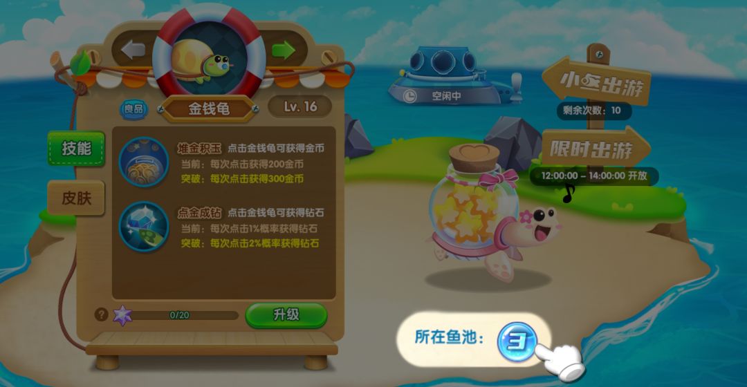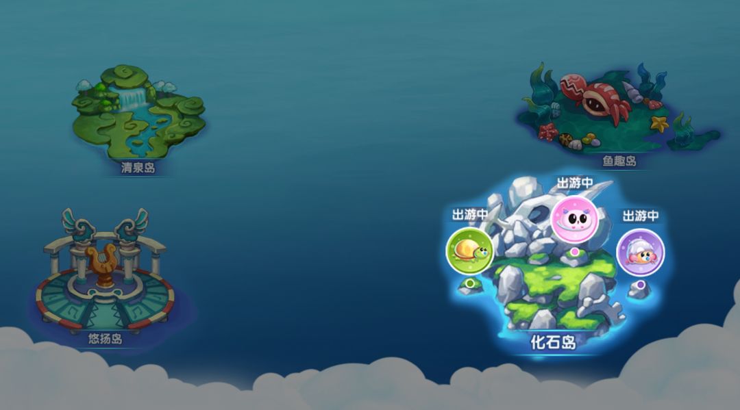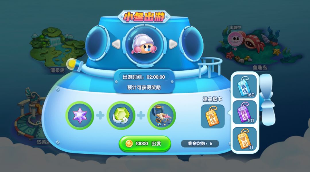 馆长点击想要去的小岛,选择想要出游的小鱼和幸运符就可以出游啦~