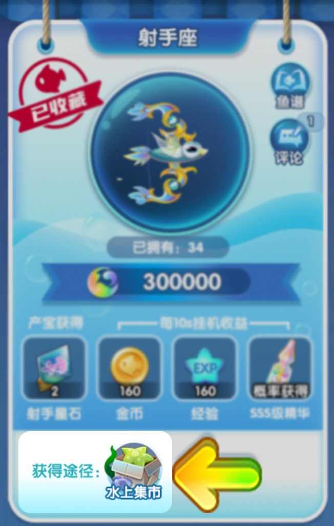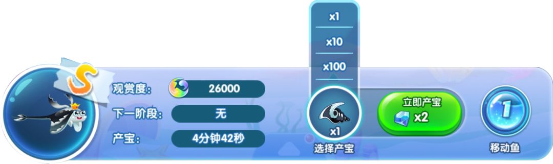 在每条小鱼的下方箭头左侧是需要的鱼宝,中间是已有数量和兑换需要的数量,右上角则是这条小鱼会产出的鱼宝~
