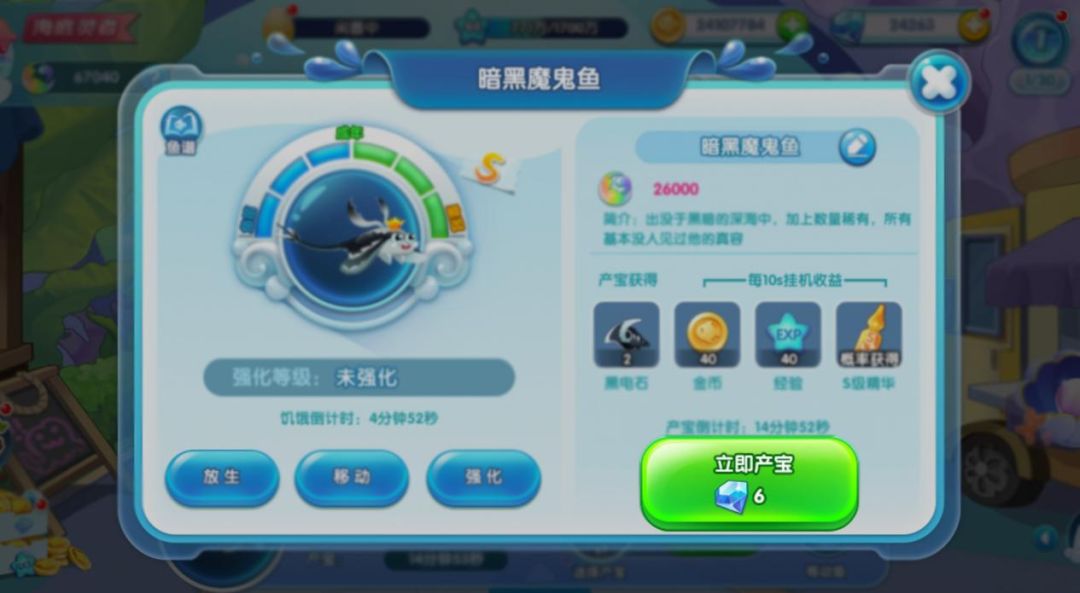 需要立即产宝出较多的宝石,可以在鱼池中点击那条小鱼,鱼池下方会显示出鱼详情。