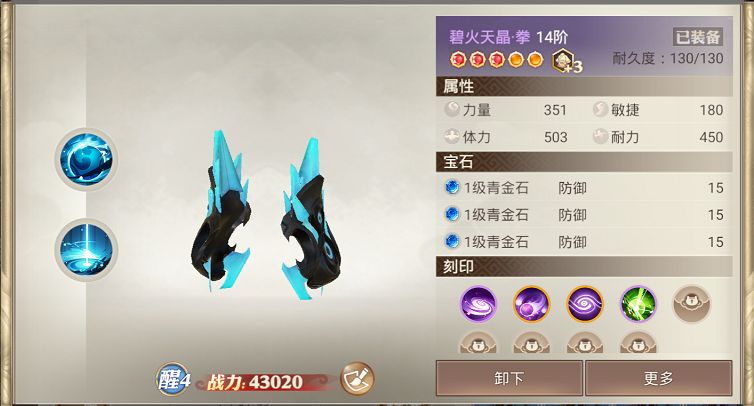 最后是刻印的推荐,增加沉默几率一定要是“高级心眼”,效果上会比紫色心眼的沉默几率高很多,有的话可以使用拳专用的“不动如山”刻印,泰山、掠影这两个保命刻印没有橙色可以使用紫色,其他可以为之可以刻印回气与其他防御刻印,因为蓝拳的主要作用是控制对方,所以不太需要输出的刻印。