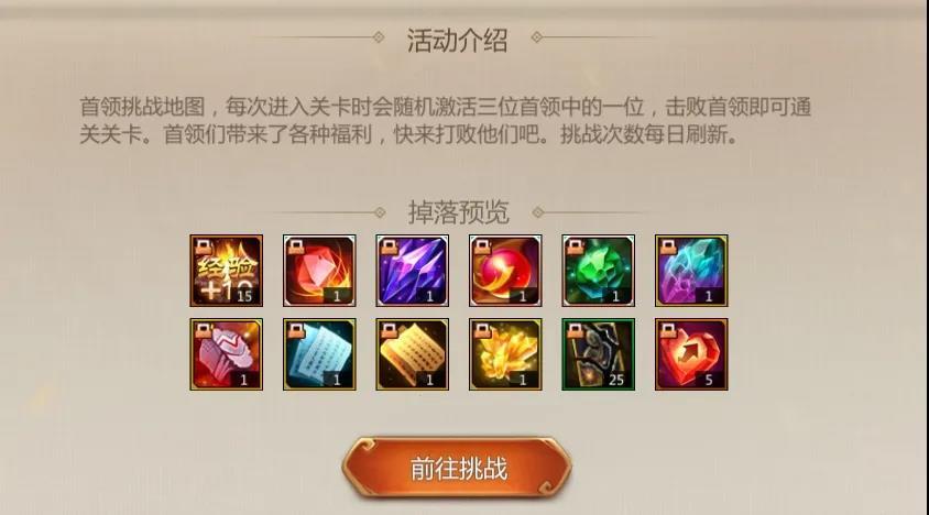 地图性质:主题活动图地图玩法:首领挑战关卡地图人数:1-5地图限时时间:10分钟地图目标:完成副本内的首领战挑战次数:每天2次,自动刷新挑战次数