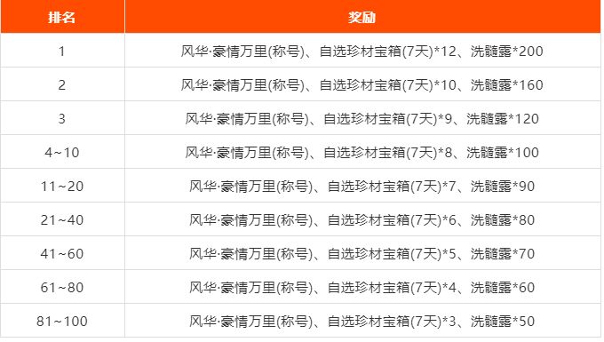 大家消耗玉曜玥可累积风华值,最终会根据风华值形成排行榜,最终排行榜的前100名根据名次会获得额外的奖励。