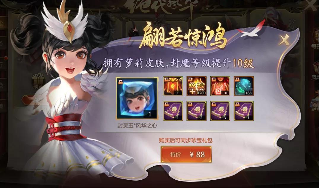 如果大家想快速提升封魔等级的话,梦梦还为大家准备了翩若惊鸿礼包。