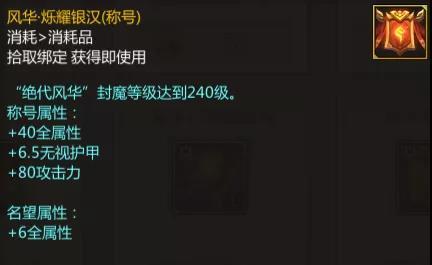要注意的是,不同的奖励兑换是有封魔等级限制的,而当大家封魔等级达到240级时,可以获得称号风华*烁耀银汉(称号)。