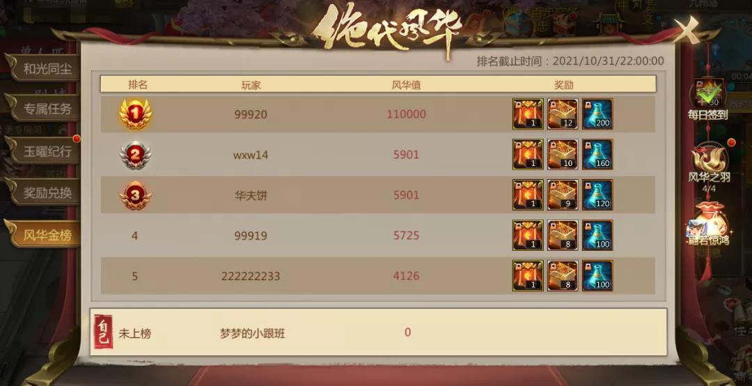 消耗玉曜玥累计风华值,风华值榜单排名截止日期为:2021/10/31/22:00:00,请大家及时领取奖励。