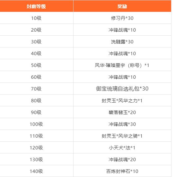 而且在封魔等级中大家还可以获取大量的洗髓露、冲锋战魂、百炼封神石等丰厚奖励。