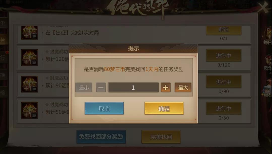 完美找回可选择找回5天内任意天数的奖励,免费找回不可选择找回天数。完美找回需要消耗的梦三币与未完成的任务数相关。