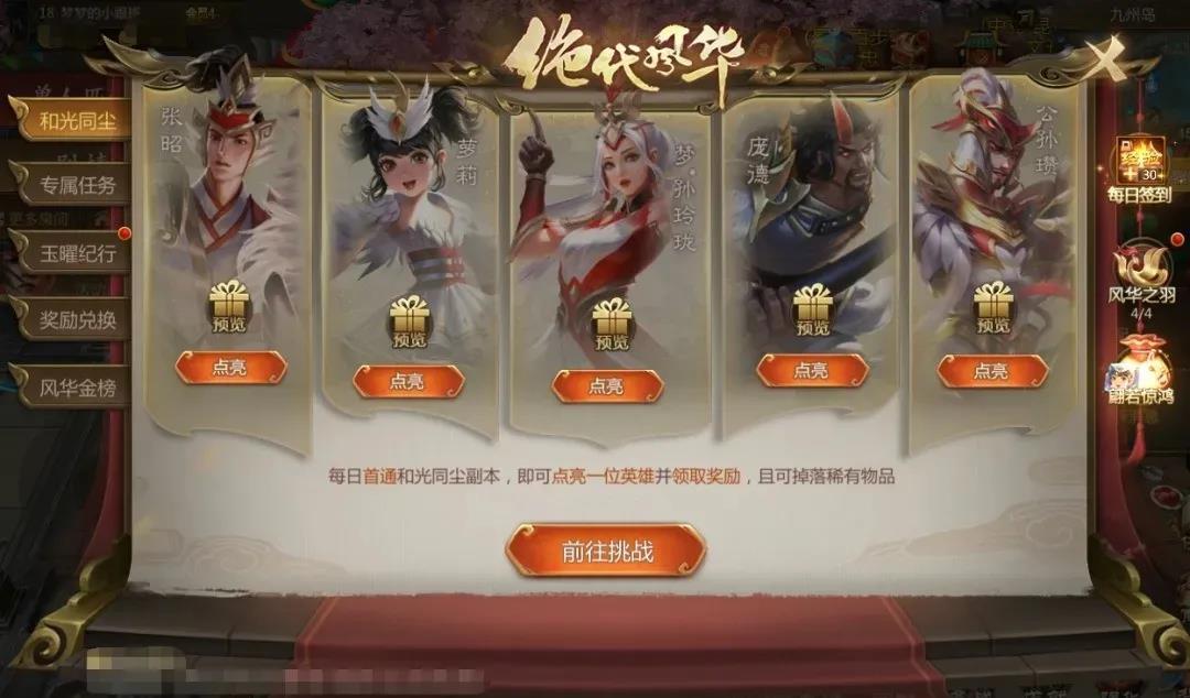 在和光同尘中,每日可进行2次和光同尘副本挑战,每日首次成功挑战后可任选一位英雄点亮,点亮成功后可获得点亮奖励和隐藏任务。