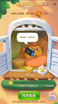 行程时间可通过闯关缩减,挑战关卡成功便能缩减莱萌行程10分钟。五段行程结束后,吃饱喝足的莱萌鸡就会躺在家里休息,等待明天新的旅程开始~