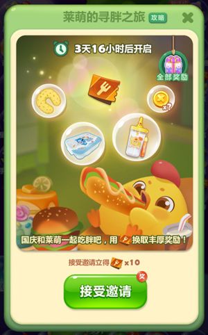 国庆小长假即将到来!莱萌鸡邀请各位小村民一起吃喝玩乐啦~9月26日开始你将收到来自莱萌鸡的假日寻胖之旅邀请,并将10张神秘餐券作为邀请信物送给你!