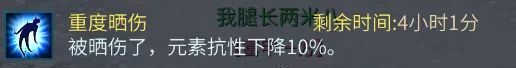 这是一种会在10:00-16:00之间发生的随机事件,小伙伴们每在隐仙湾待半小时就有几率晒伤,其中分别为轻度晒伤、中度晒伤、重度晒伤。这会分别造成小伙伴们的所有元素抗降低2%、5%、10%,持续整整12个小时!