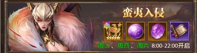 【蛮夷入侵】每周二、四、六8:00~22:00开启,玩家每天有2次免费挑战机会,根据玩家对boss造成的伤害进行排名,每晚22:00发放排名奖励,同时按照全服伤害累计值发放全服奖励!
