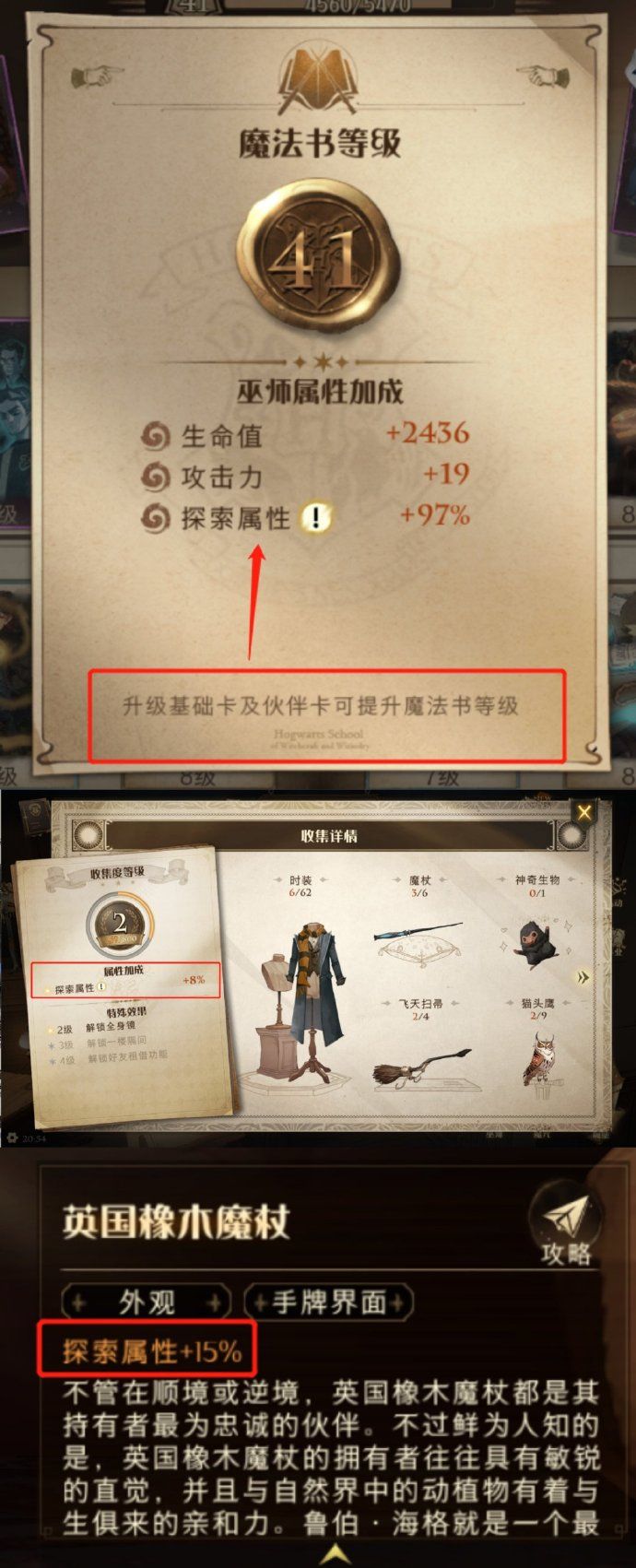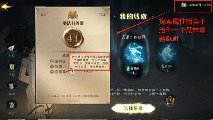 3、在禁林开始界面可以看到探索属性,在非决斗场景,他会给你带来增益