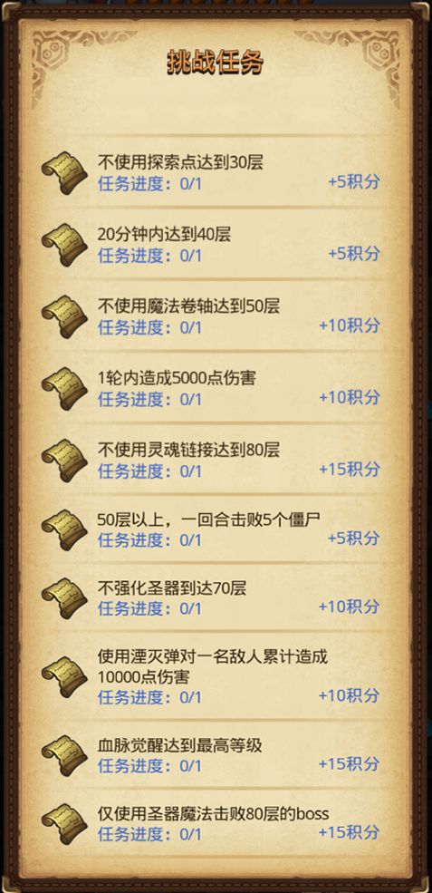挑战任务与往常类似,需要挑战极限,花点心思和技巧,比如不用魔法上50层、一回合暴打5个僵尸等,完成后可增加积分