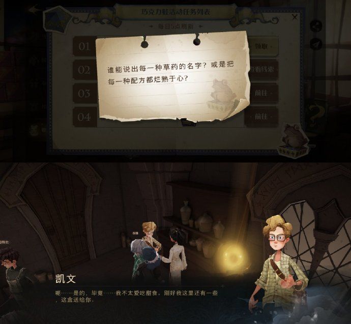 前往【城堡主楼】,沿着楼梯一直往下走找到【魔药课】教室,在教室里和NPC【凯文】对话即可。