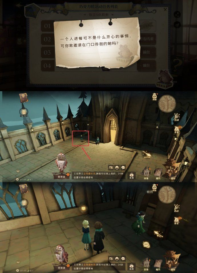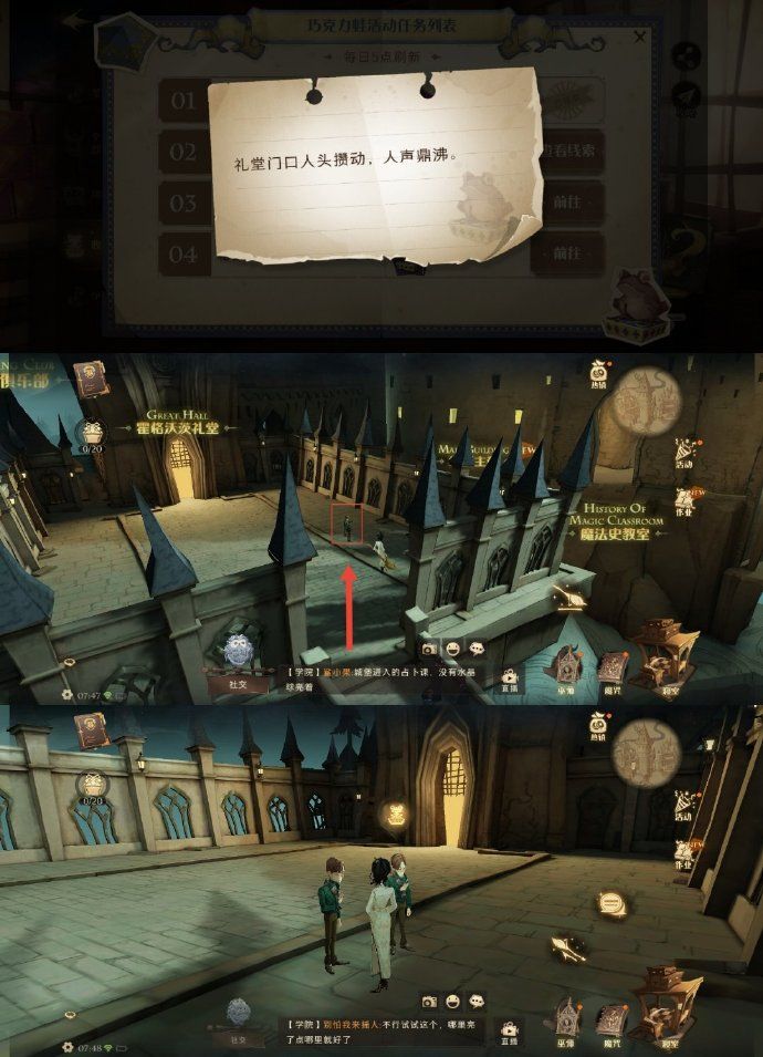前往【城堡上空】,飞向决斗俱乐部(或礼堂的方向),在礼堂的左侧可以看到背对我们的傲娇卡姐。和卡姐对话拿到今日巧克力蛙。