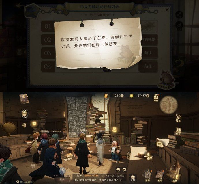 前往【城堡主楼】,沿着墙壁一直往上走,在图书馆的上面一层找到npc【纳威】,和他对话可领取今日巧克力蛙。