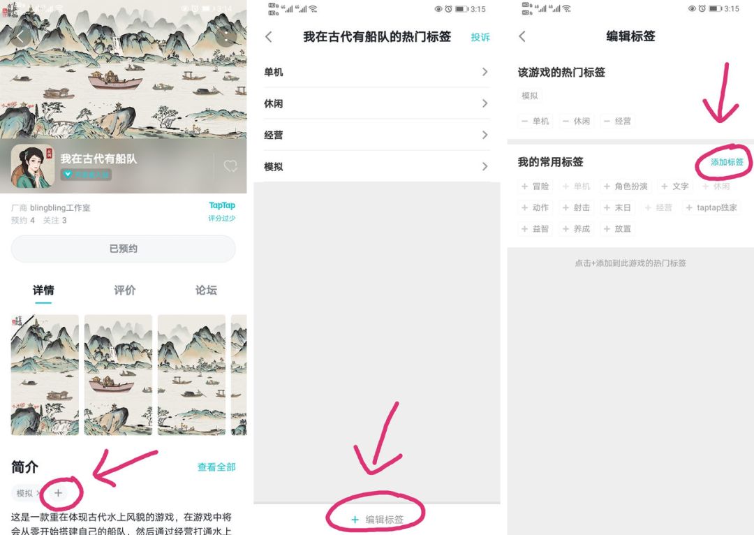 添加下您觉得想在游戏中体验到的玩法,或者风格、特点等标签(可参考下图由左到右进行操作),比如“单机”、“养成”、“休闲”、“经营”、“放置”、“佛系”等都可以