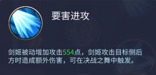 剑姬被动增加攻击554点,剑姬攻击目标侧后方时造成额外伤害,可在决战之舞中触发。