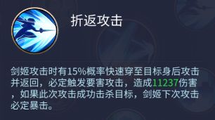 折返攻击:剑姬攻击时有15%的概率快速穿至目标身后攻击并返回,必定触发要害攻击,造成11237伤害,如果此次攻击成功击杀目标,剑姬下次攻击必定暴击。