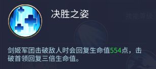 决胜之姿:剑姬军团击破敌人时会回复生命值554点,击破首领回复三倍生命值。
