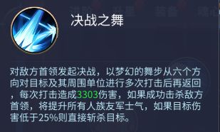 决战之舞:对敌方首领发起决战,以梦幻的舞步从六个方向对目标及其周围单位进行多次打击后再返回,每次打击造成3303伤害,如果成功击杀敌方首领,将提升所有人族友军士气,如果目标伤害低于25%则直接斩杀目标。