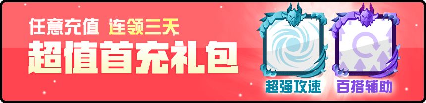 新手首充礼包。充值消费任意金额,首日立即领取「传说级台风方块x1」,二段变身极限攻速,非常适合新手使用的输出型方块。次日及三日登录,可额外领取「铂金宝箱x1、钻石x100、金币x5000」