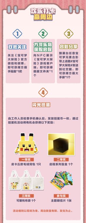 关注《宝可梦大探险》官方微博和微信,即可活动宝可梦大探险方萌扇子;向NPC展示手机内游戏客户端画面即可获得宝可梦大探险萌趣文件夹;和展台任意宝可梦元素合影并带上话题#宝可梦大探险#发布到社交圈即可获得宝可梦大探险方萌购物袋。此外还可以参加扭蛋机获得,有机会获得皮卡丘毛绒背包,盲盒,帆布袋,主题明信片等超多周边好礼。