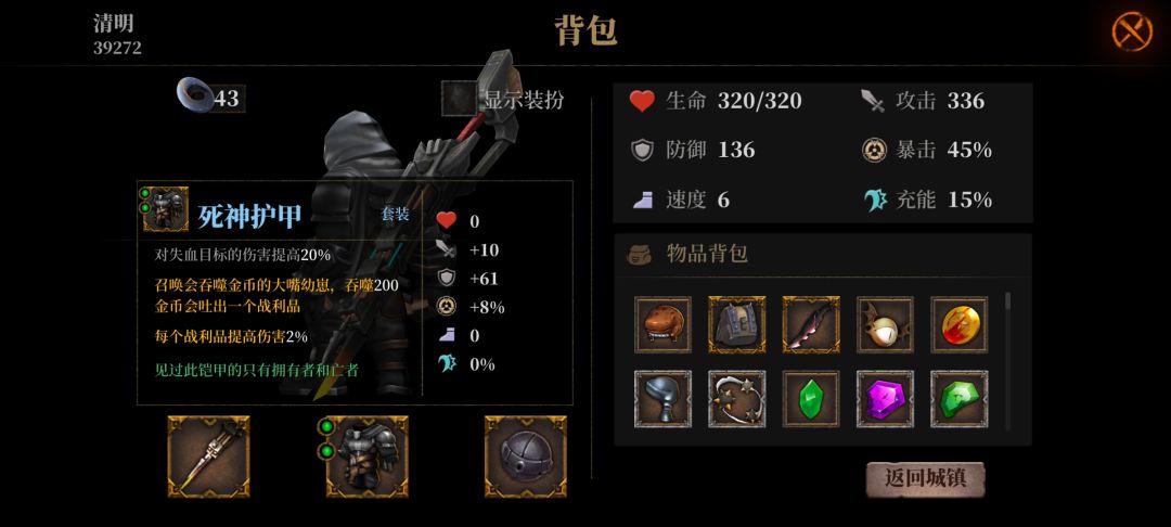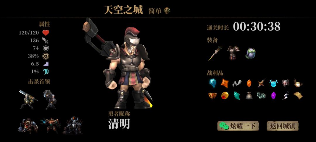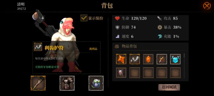 大鹅暴击概率眩晕,圣光护符眩晕百分百暴击,冲击弩一次攻击多段伤害,利齿护符每攻击一次会一滴血但是冲击弩一次能回6滴左右(这个没数),这样打boss基本不需要走位,boss全程眩晕而且全是暴击伤害打的也快,下面是我的战绩打完暗魔领主满血。