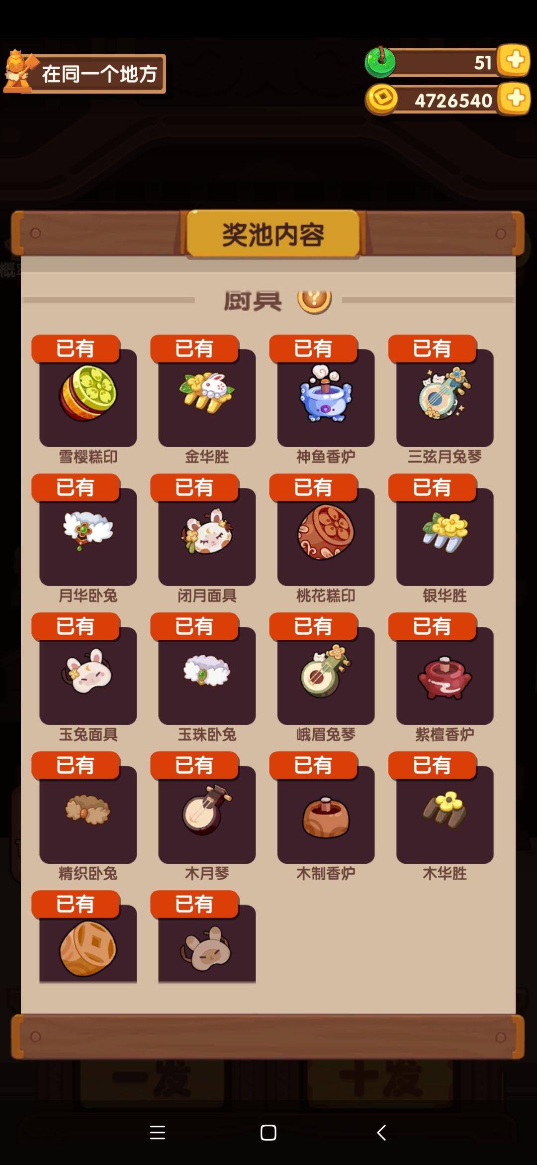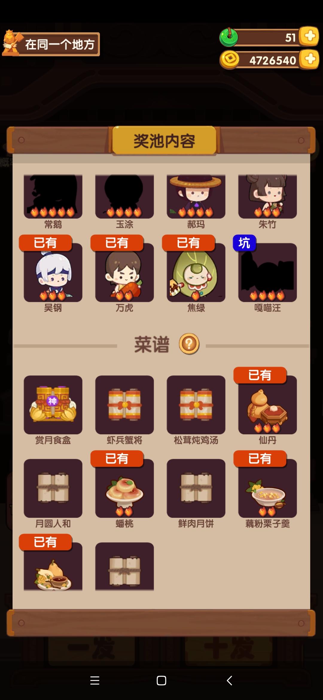 小号的抽池总结:已抽55发,只出了一个4火厨子,目测要非,大大吉水了。此账号出货特点:1~40发,所有出货及100玉璧奖励都在单数发,偶数发只出菜或者混搭1-2火厨具;一到41发开始反向出货,单数只出菜及低级厨具,偶数发出了3个菜谱加厨子。