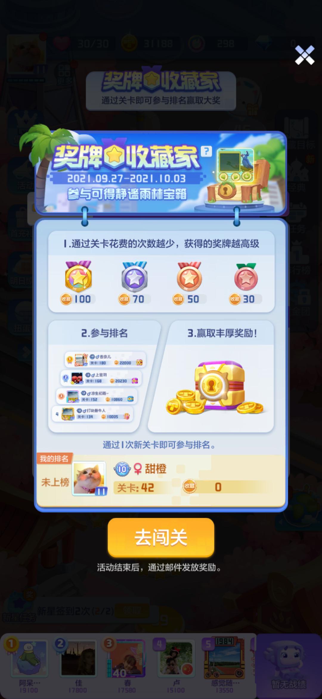 小方块们可于9月27日—10月3日参与活动,通过闯关获得奖牌,可提高奖牌收藏排名,名次靠前者,不仅能获得丰厚奖励,还能领取静谧雨林宝箱,体会雨林的独特魅力之处~